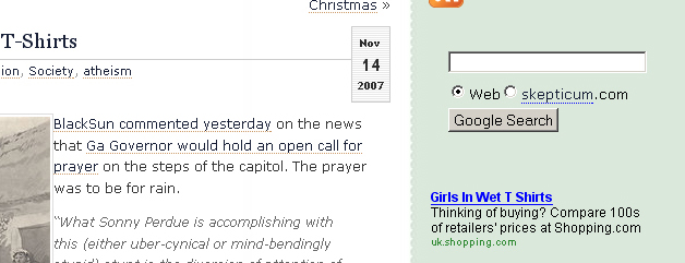 Awesome! I weaved in the reference to wet tshirts because a reader of mine, Ben had offered the atheist wet-tshirt contest idea in a comment to one of my irreverent Halloween posts. And as always when I write, I lost my train of thought and I forgot to mention Ben’s idea. I’m glad to see those at the church of google picked up on it as well. 🙂